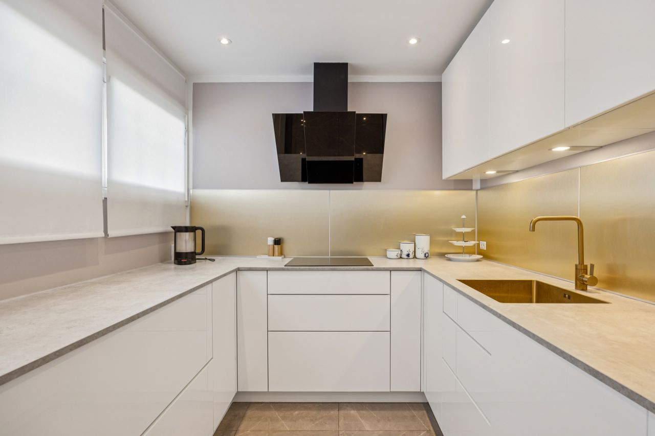 Køkkenet fremstår stilrent og indbydende med god skabsplads og en naturlig sammenhæng til opholdsrummet, hvor der er plads til både spisebord og sofaarrangement. Badeværelset er udført med separat bruseniche og toilet – en sjælden luksus i denne type lejligheder.